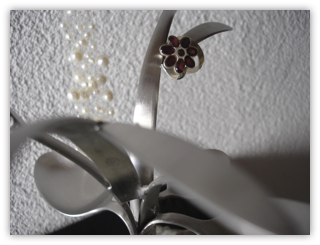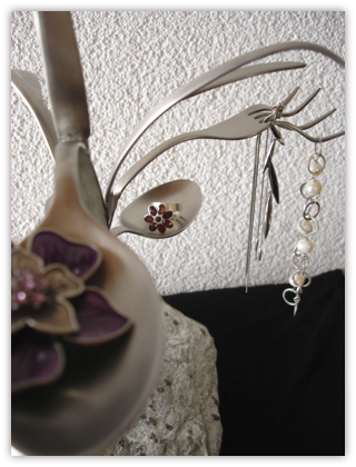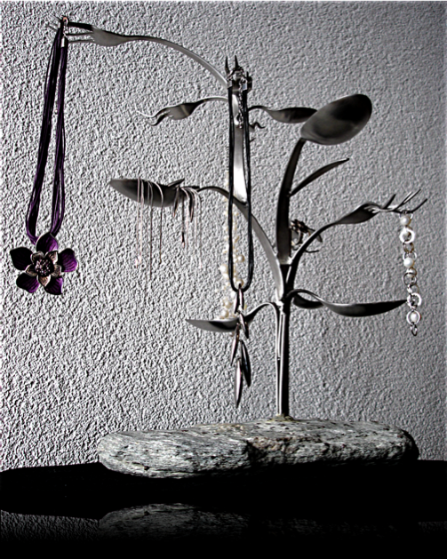 Ok, ich habe nicht DIESES Besteck verwendet. Ich habe lediglich vergessen, mit Fotos ordentlich zu dokumentieren. Die Botschaft sollte aber klar sein: Der Schmuckstände wächst so wie er oben gebildet ist nicht aus Steinen raus. Besteck gibt‘s für wenig Geld in Haushaltläden/-abteilungen. Große Löffel und Gabeln liegen bei etwa 2,50 bis 3 Euro, die kleine Ausführung kostet etwa einen Euro weniger. Also MAXIMAL 20 Euro für‘s Besteck. Den Stein gibt‘s gratis aus der Landschaft (meiner kam aus einem Österreichurlaub). Die reinen Materialkosten sind somit wohl klar.