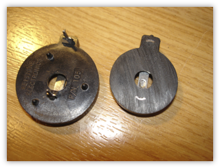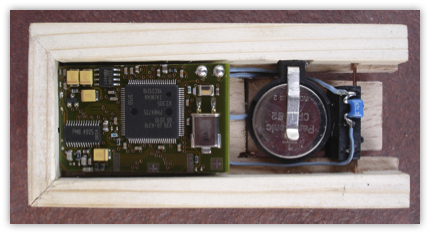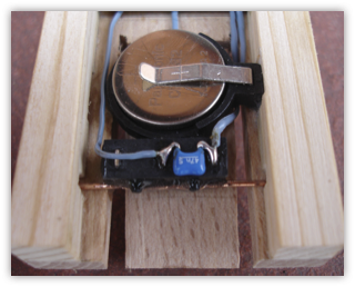 Am Knopfzellenhalter werden die Abstandsnippel und die Kontakte für den Printanschluss abgeschnitten und flachgeschliffen um die Bauhöhe zu verringern. Batteriehalter und Mikrotaster werden mit Zweikomponentenkleber auf die Rückseite der Mausefalle aufgeklebt. Siehe nachfolgende Abbildungen.