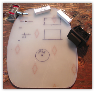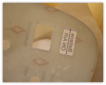 Das Layout wird am Computer erstellt und ausgedruckt. Pergamentpapier gibt‘s im besser sortierten Schreibwarenladen und lässt das Licht der LEDs durchscheinen. Der Ausdruck auf den A4-Bogen wird folgendermaßen auf die Grundplatte übertragen: Gebohrte Grundplatte mit Spiritus entfetten, Rückseite des Pergamentbogens im Klebebereich vollflächig mit dem Prittstift einpinseln. Vorsicht: Das Papier möchte sich dann gerne rollen! Nun die Grundplatte auflegen und in Position bringen. Zum Korrigieren der Position bleibt nur wenig Zeit und das Papier reißt leicht. Wellen glattstreichen und sofort mit schweren und planen Gegenständen (z. B. viele Bücher) beschweren und trocknen lassen. Mit einem scharfem Skalpell oder Teppichmesser lassen sie dich überstehenden Teile abschneiden und die Bohrungen für Taster, Schalter und Poti freischneiden. Die Aussparung für die LEDs bitte nicht befreien ;-)