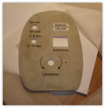 ...besteht bei meiner Version aus einer FR4-Platine, von der die Kupferkaschierung heruntergeätzt wurde. Die Beschriftung wird auf Pergamentpapier gedruckt und mit Prittstift :-) aufgeklebt. Mal schauen, was die Luftfeuchtigkeit und die natürliche Alterung dem Prittkleber so antut. Eventuell gibt‘s hier später noch Handlungsbedarf.