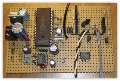 ...kommt mit einer handvoll Bauteilen auf einer Lochrasterplatine aus: Herzstück ist wohl ein etwa 10 Jahre alter Sprachspeicher-IC ISD1016. Dieser Voicerecorder kann 16 Sekunden Ton aufnehmen. Die Aufnahme kann über ein angeschlossenes Mikrofon oder direkt über einen entsprechend gekoppelten Eingang erfolgen. Das Mikrofon ist in diesem Fall wohl praktischer. Der Speicherbereich der aufgenommen Toninformationen ist adressierbar. Für diese Anwendung wird er in 2 Bereiche unterteilt, sodass ein Bereich für 6 Sekunden und einer für 10 Sekunden Aufnahme/Wiedergabe zur Verfügung steht.