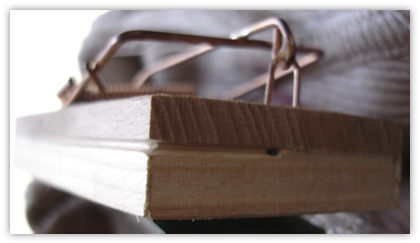 Als kleiner Gag sollte die Falle gespannt aussehen. Damit sich niemand wirklich verletzt, wird das Metallgestänge entfernt, die Feder durch drehen gegen den Uhrzeigersinn entspannt und das Gestänge wieder aufgesetzt. Durch kleine Lötpunkte an der Unterseite kann der Schlagbügel und die Haltestange in einer gespannt aussehenden Position fixiert werden (Bilder siehe weiter unten).